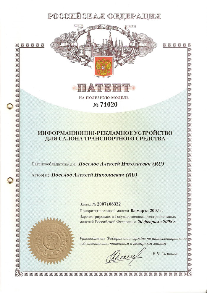 Патент Патент на полезную модель №71020 от 5 марта 2007г.(«Информационно-рекламное устройство для салона транспортного средства»).